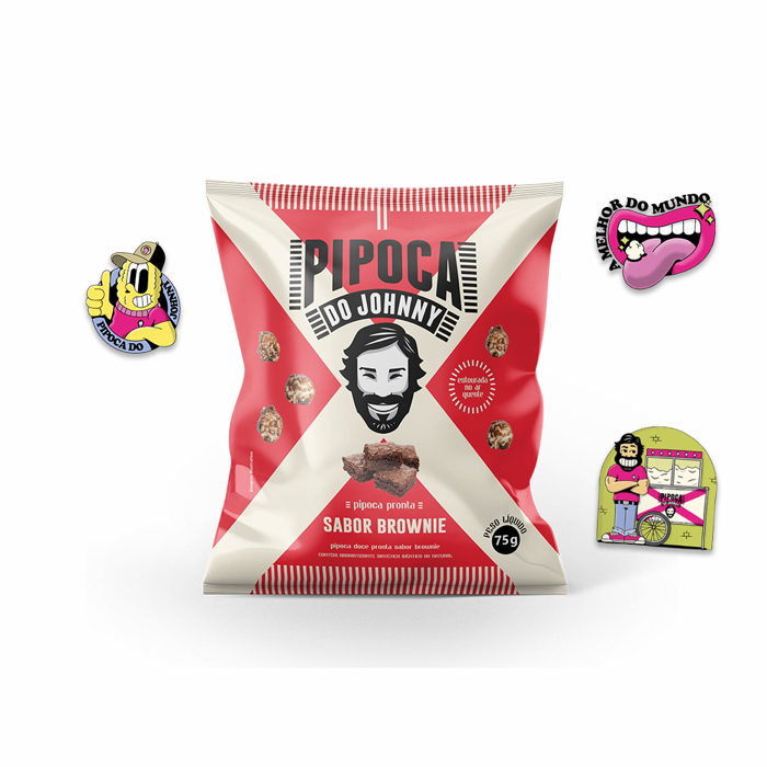 Johnny’s Popcorn – Brownie (Caixa com 15 unidades) Pipocas Prontas - sabor Brownie (75G) Ingredientes: Milho de pipoca estourado, Açúcar demerara, Xarope de glucose, óleo de girassol, Açúcar mascavo, Manteiga, Cacau em pó, Sal, Aromatizante e Emulsificante lecitina de soja.